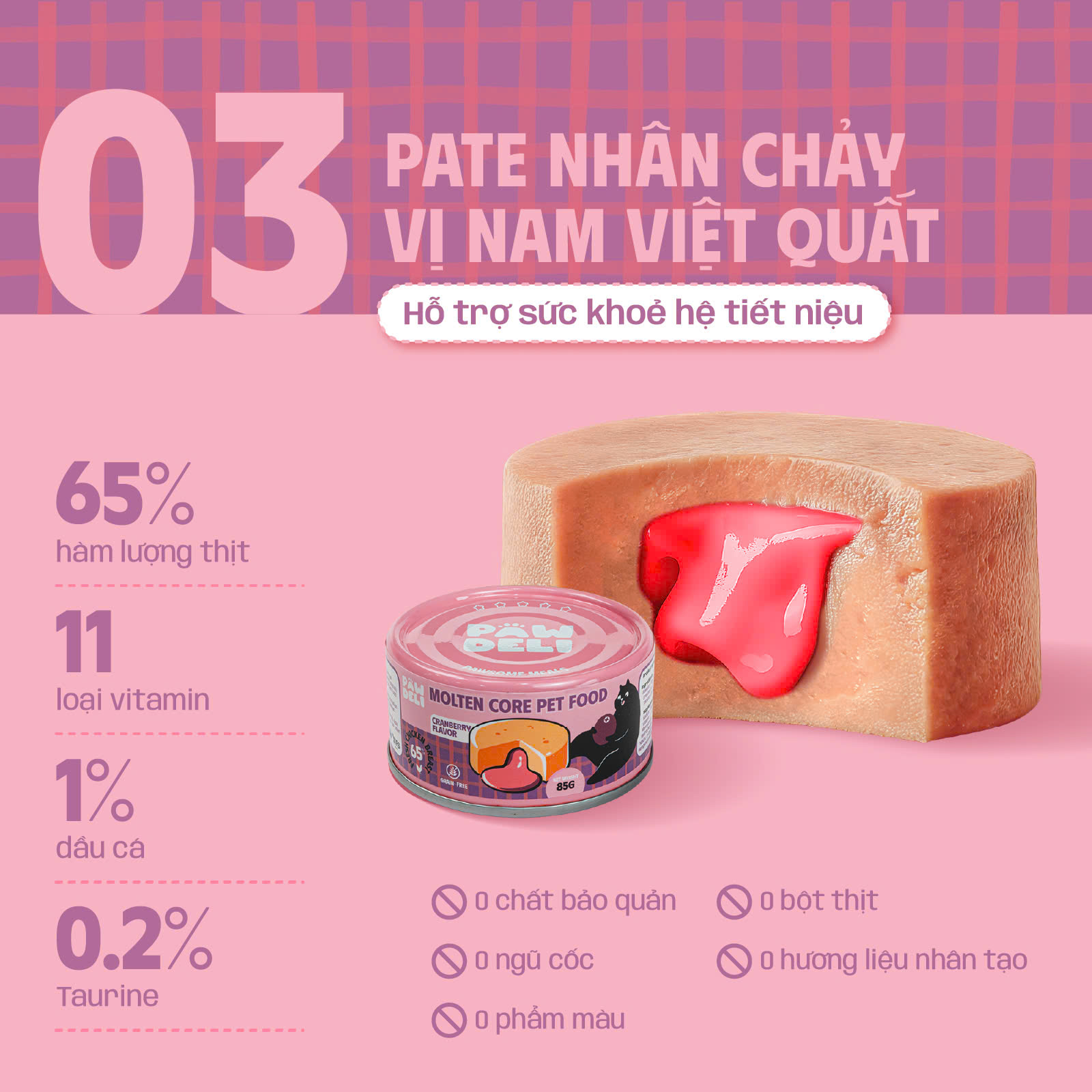 Pate giàu protein chất lượng cao với thành phần chính từ thịt gà (65%). Nhân chảy vị nam việt quất hỗ trợ hệ tiết niệu khỏe mạnh. giúp ngăn chặn vi khuẩn gây hại và giảm nguy cơ nhiễm trùng. Độ ẩm cao kết hợp chất chống oxy hóa bảo vệ bàng quang, giúp mèo cưng luôn khỏe mạnh và đủ nước.